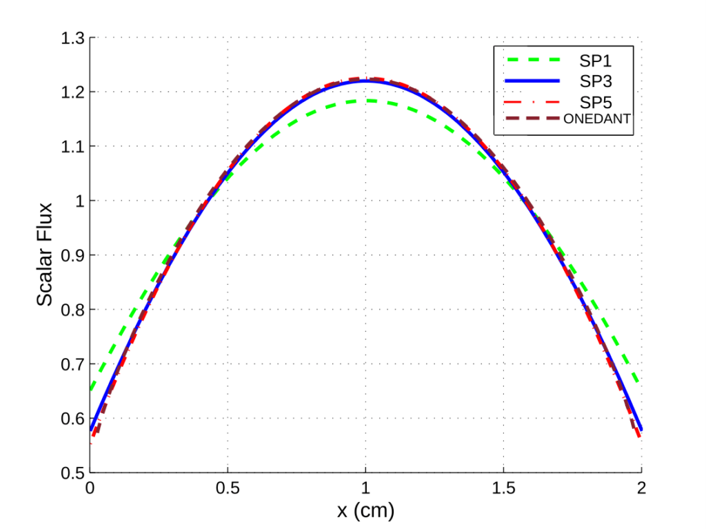 1D: Scalar flux for an example of a homogeneous slab of 2 cm solved with vacuum, zero current and zero flux boundary conditions.