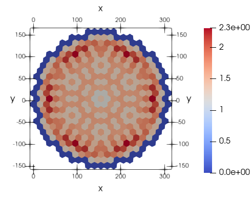 3D_VVER440: Half radial plane of the neutronic power with a hexagonal 3D benchmark.
